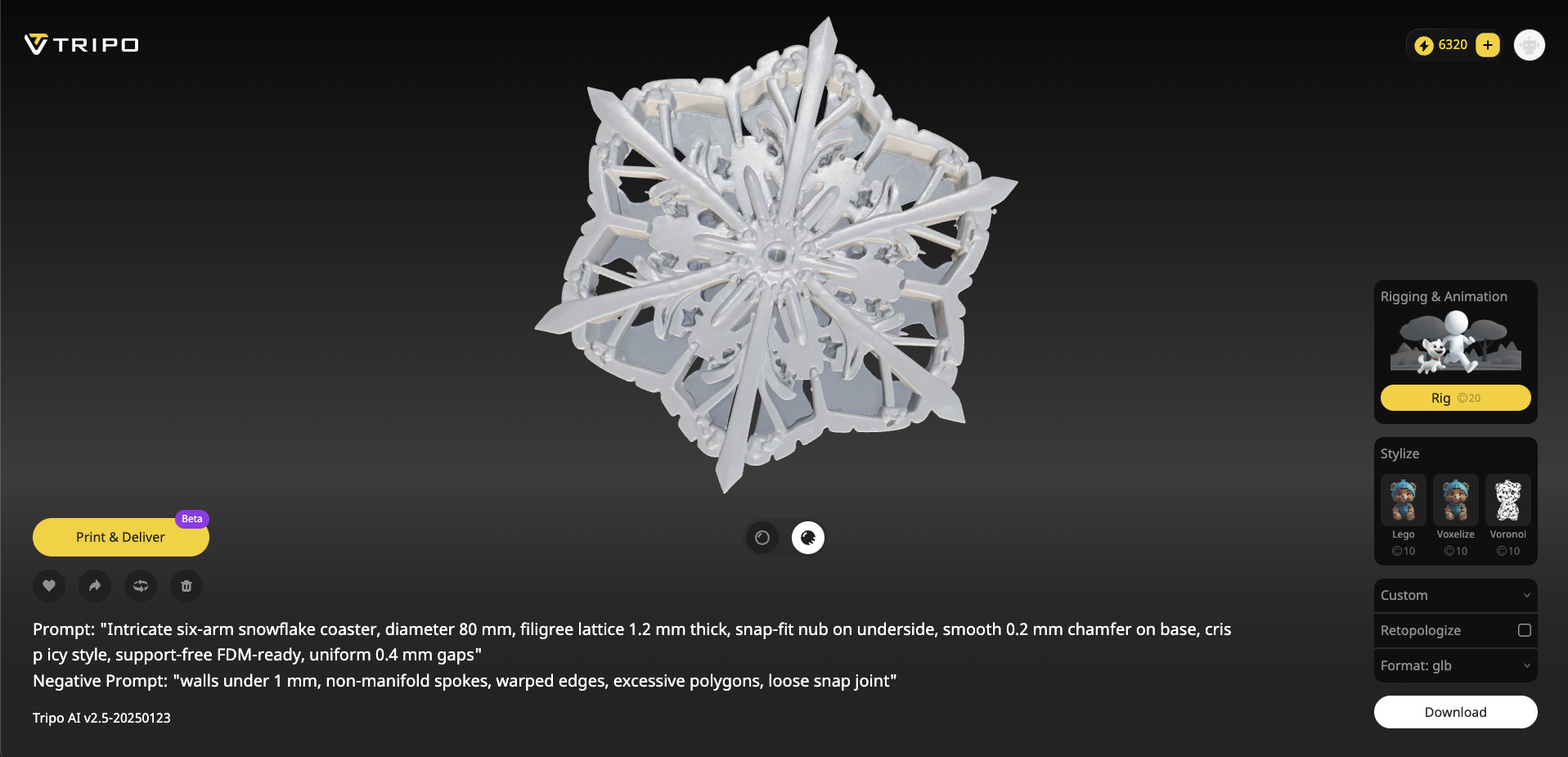 This seamless process means you can design and order any of the holiday 3D-print ideas in this article without owning a printer or learning complex modeling software. Tripo AI handles everything from model generation to production and delivery, making custom holiday decorations accessible to everyone.