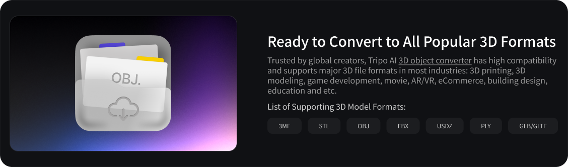 You can convert to and from the most widely used 3D formats: OBJ, FBX, STL, USDZ, GLB/GLTF, 3MF and more.
