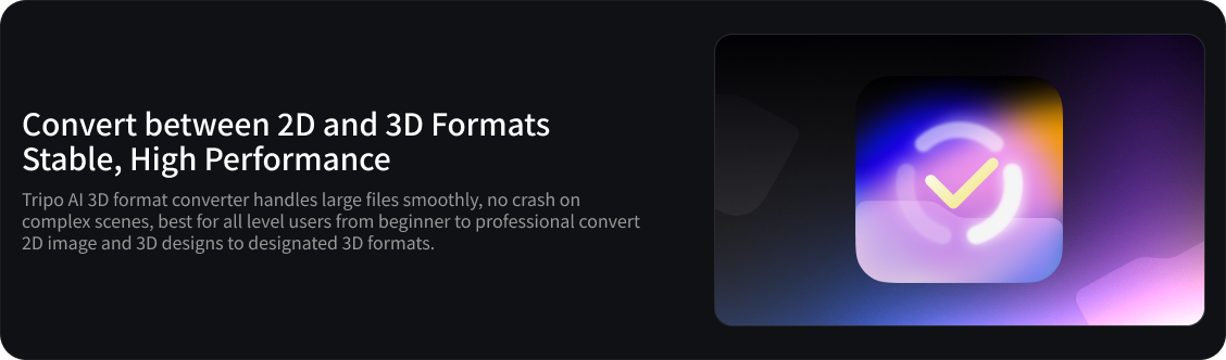 The converter automatically detects your uploaded file (2D image or 3D model) and transforms it into the target format you need. During conversion, Tripo AI performs automatic mesh cleanup, normal smoothing, and basic repairs to ensure geometry integrity and texture consistency.