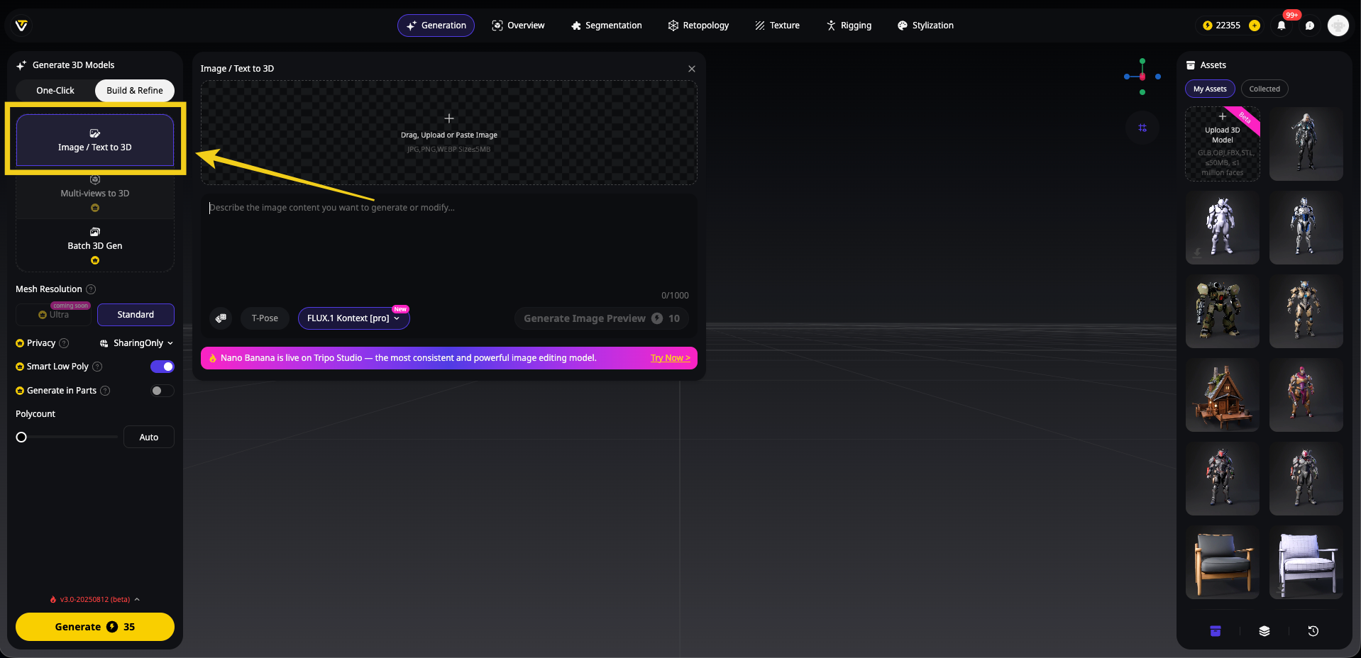 Open Tripo Studio and click on "Image / Text to 3D" in the Generate workspace. This is your creative command center.