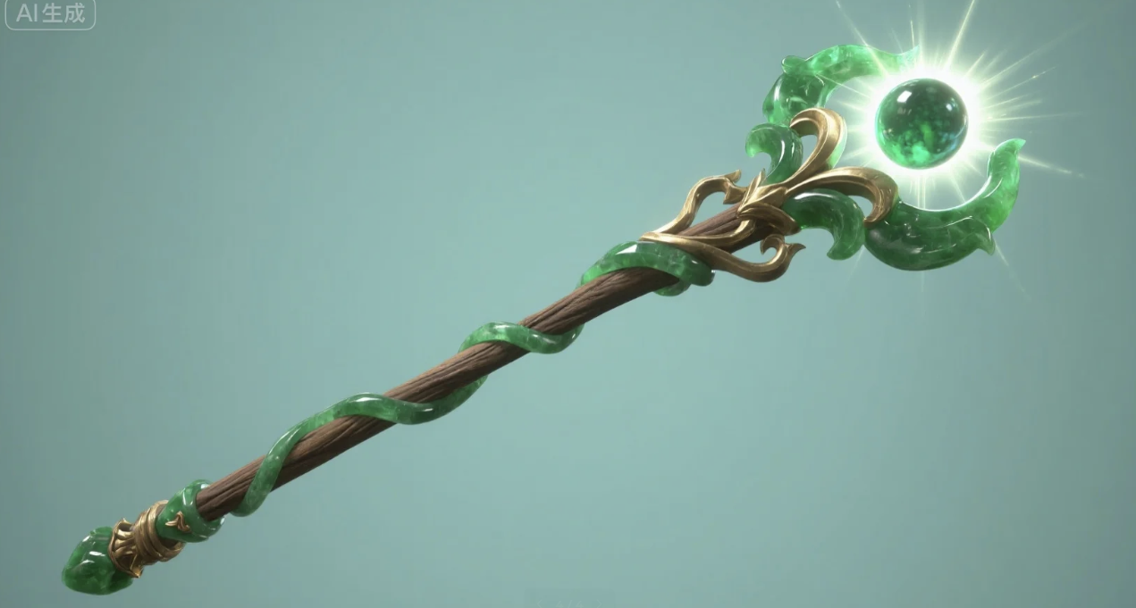 "A twisted, ornate fantasy staff with a large glowing green orb and swirling green gemstone or glass decorations along the shaft."