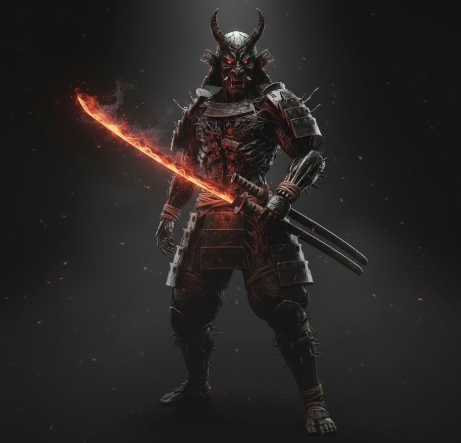 "A 3D model of a demonic samurai, wearing a shattered obsidian armor, its body is a mass of pulsating black veins and sinew, wielding a katana with a glowing, hellish blade, Japanese Oni mask. 全身"