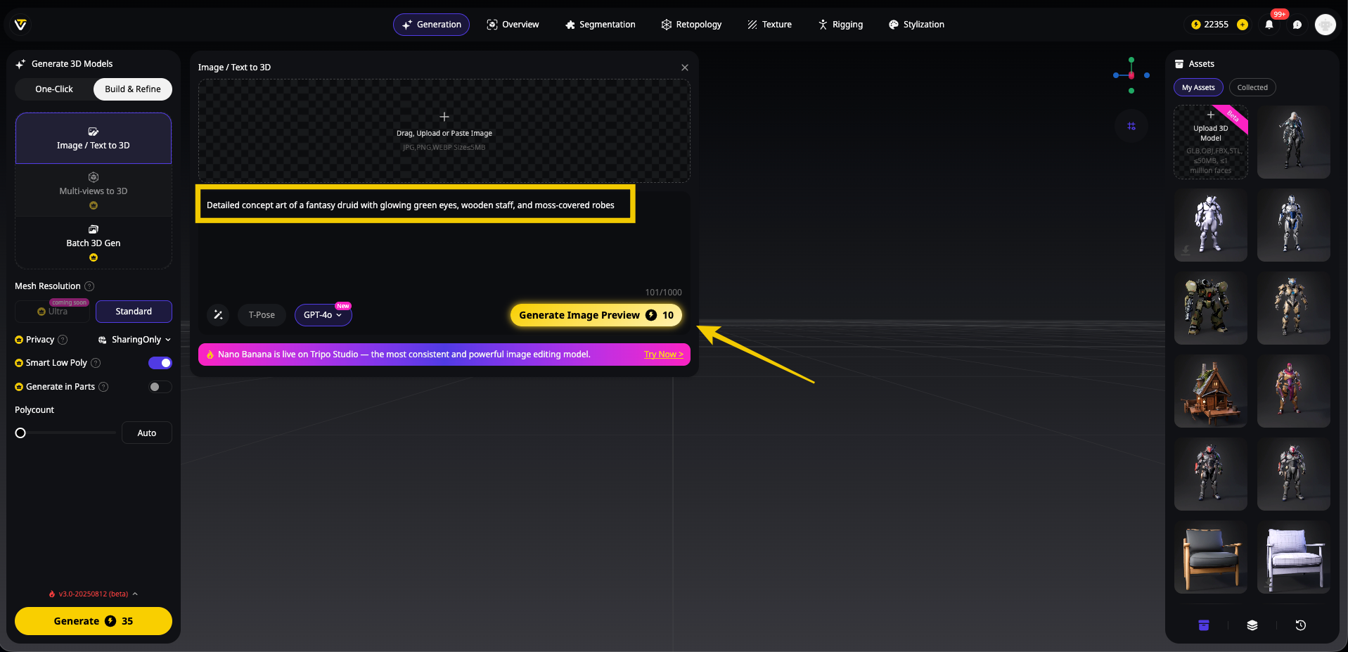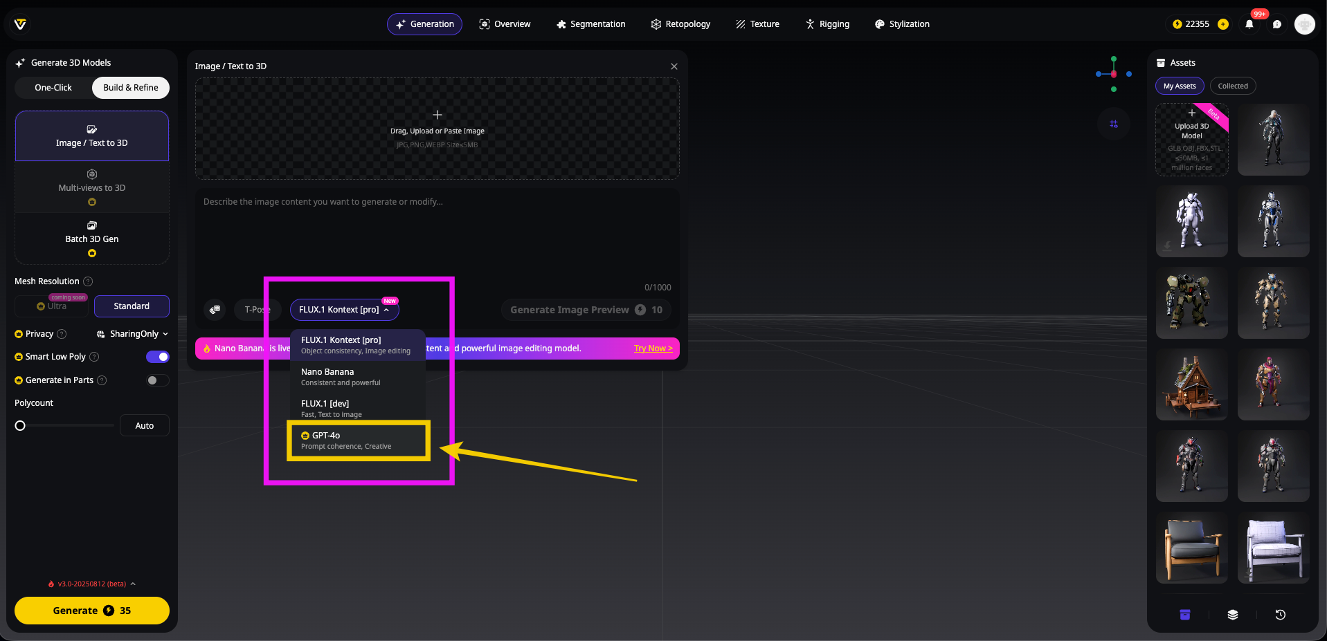 Tripo Studio integrates GPT-4o Image Generator seamlessly, so creators can produce new images or refine uploads and then flow directly into AI texturing tools and style transfers. Let's dive into the practical workflows that'll transform your creative process.