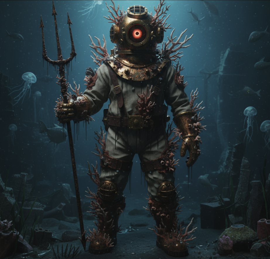 "A 3D model of a Victorian-era deep sea diver, its suit is fused with grotesque coral and barnacles, holding a rusted trident, with a single glowing, malevolent eye peering from the helmet, dark and eerie atmosphere."