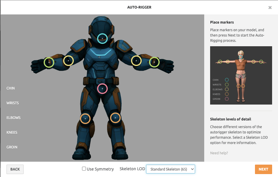 Mixamo displays marker points for you to position. Here's the optimal placement: