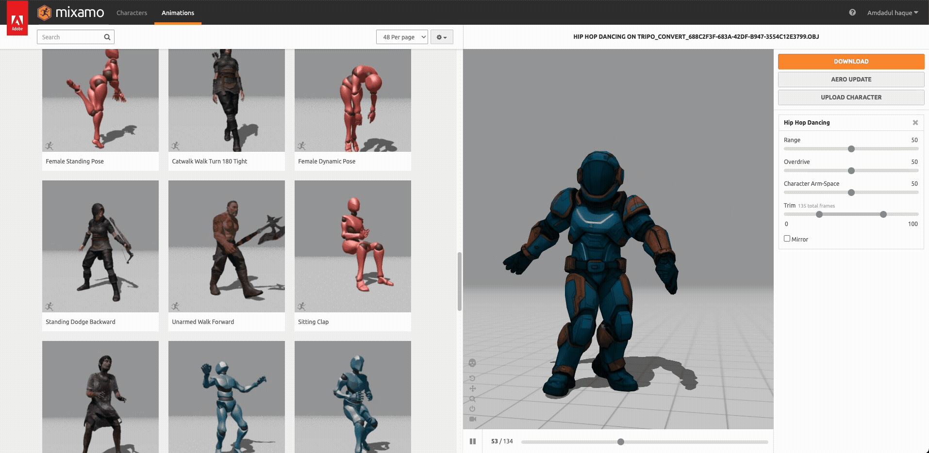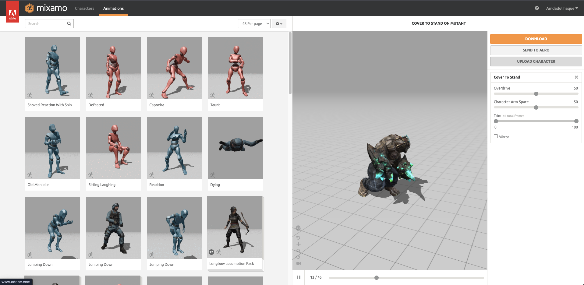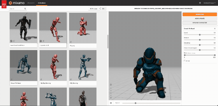 Once rigged, access Mixamo's 2,500+ animations: