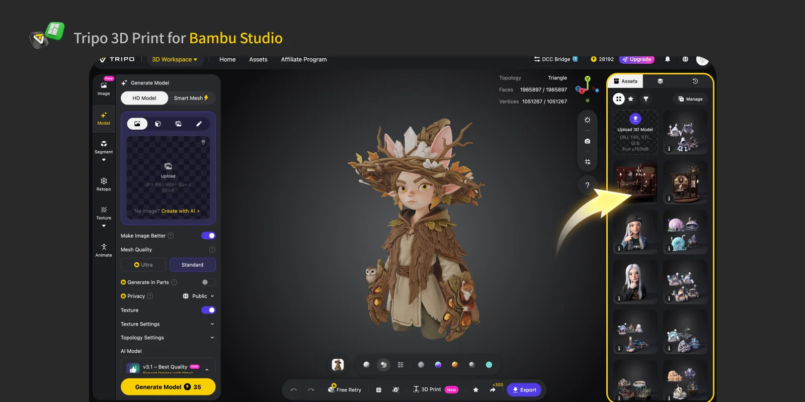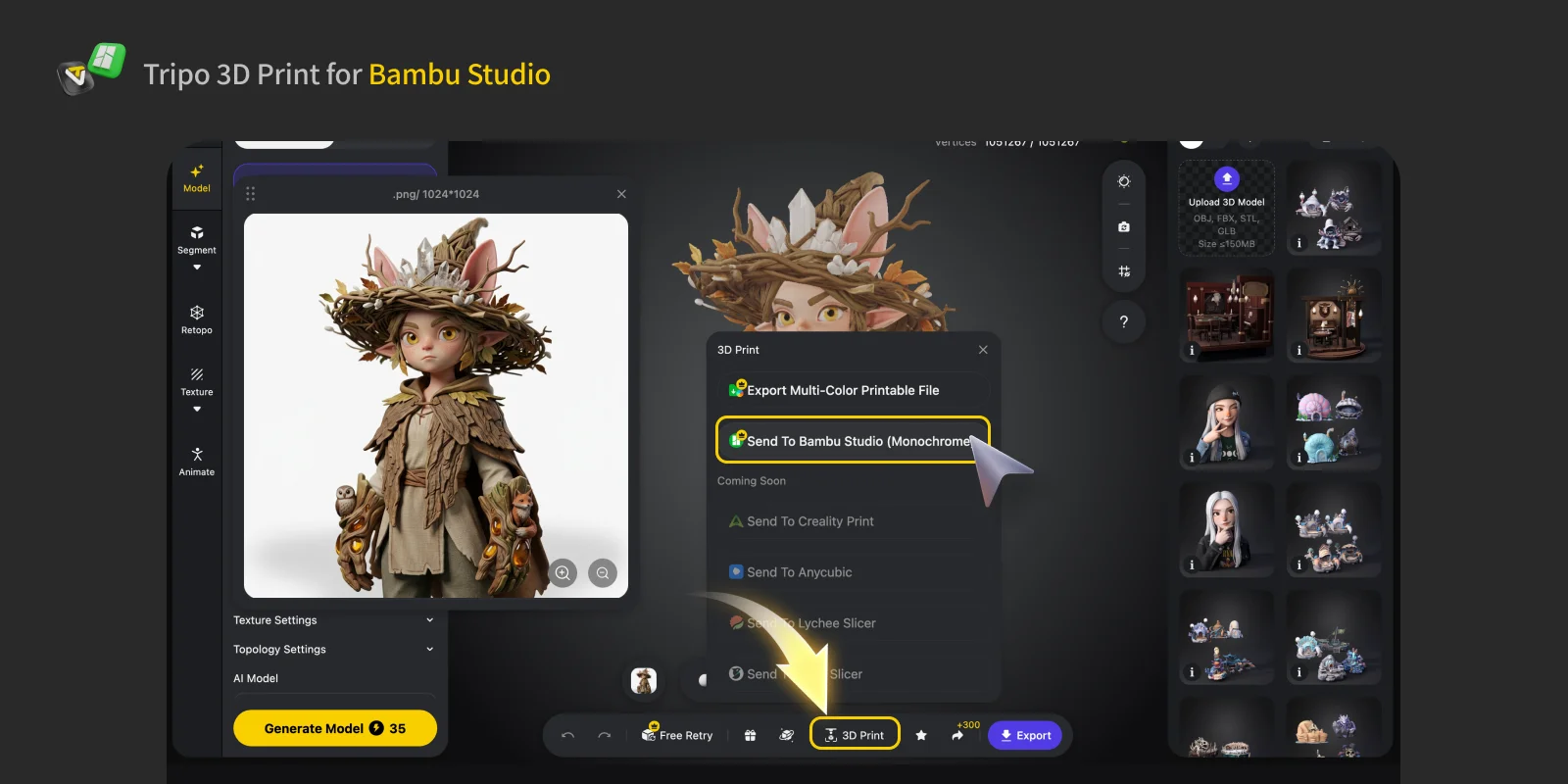 Tripo Studio supports one-click sending of models directly to Bambu Studio. There is no longer any need to manually download, save, and import 3D model files. With this feature, a 3D model generated by Tripo AI can go straight from your browser into your slicing software, Bambu Studio, with just one click.