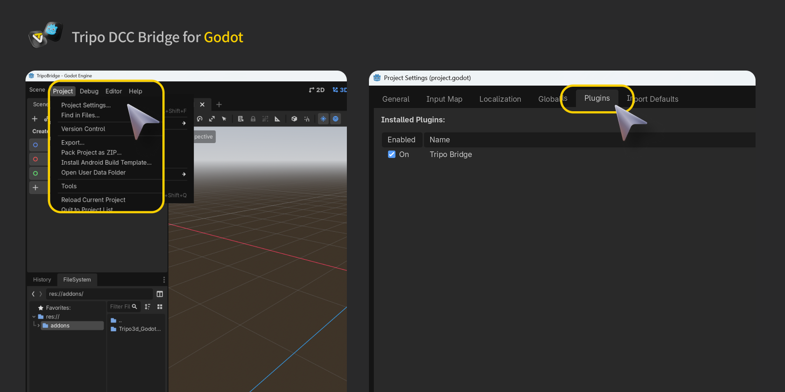 - Import the Package into Godot, open your project and navigate to: Project → Project Settings → Plugins. Make sure the Tripo Bridge plugin is enabled.