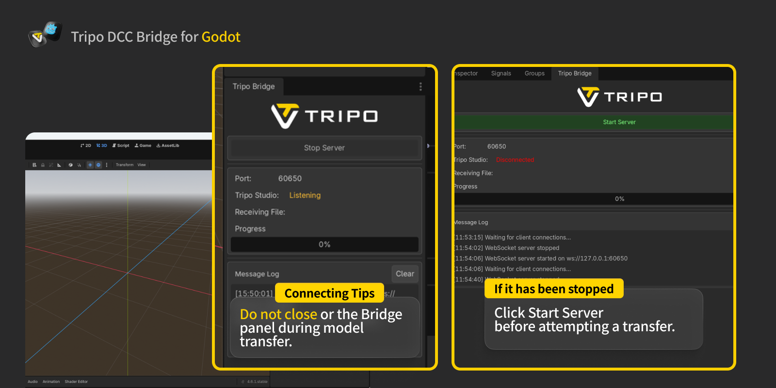 - The Bridge service must remain running while connecting to the web browser. Do not close Godot or the Bridge panel during model transfer.
