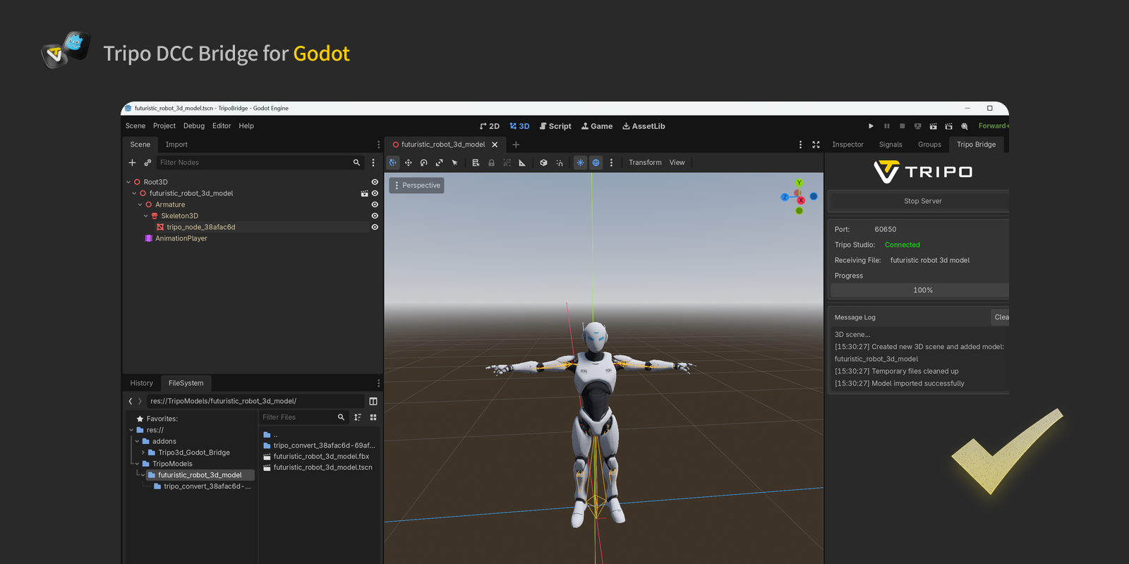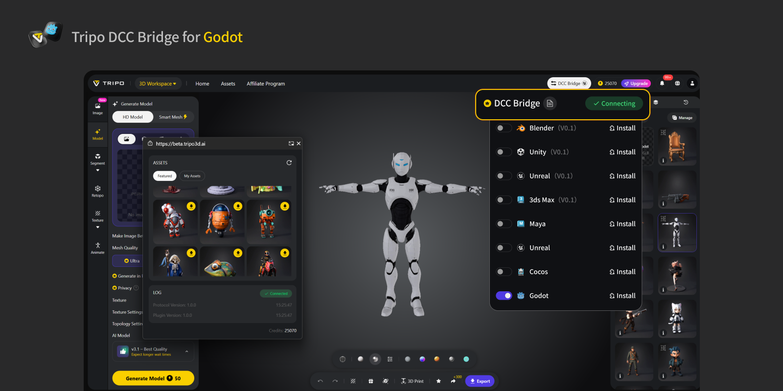 Tripo3D Godot Bridge is a lightweight plugin that connects Godot directly to the Tripo Studio frontpage.