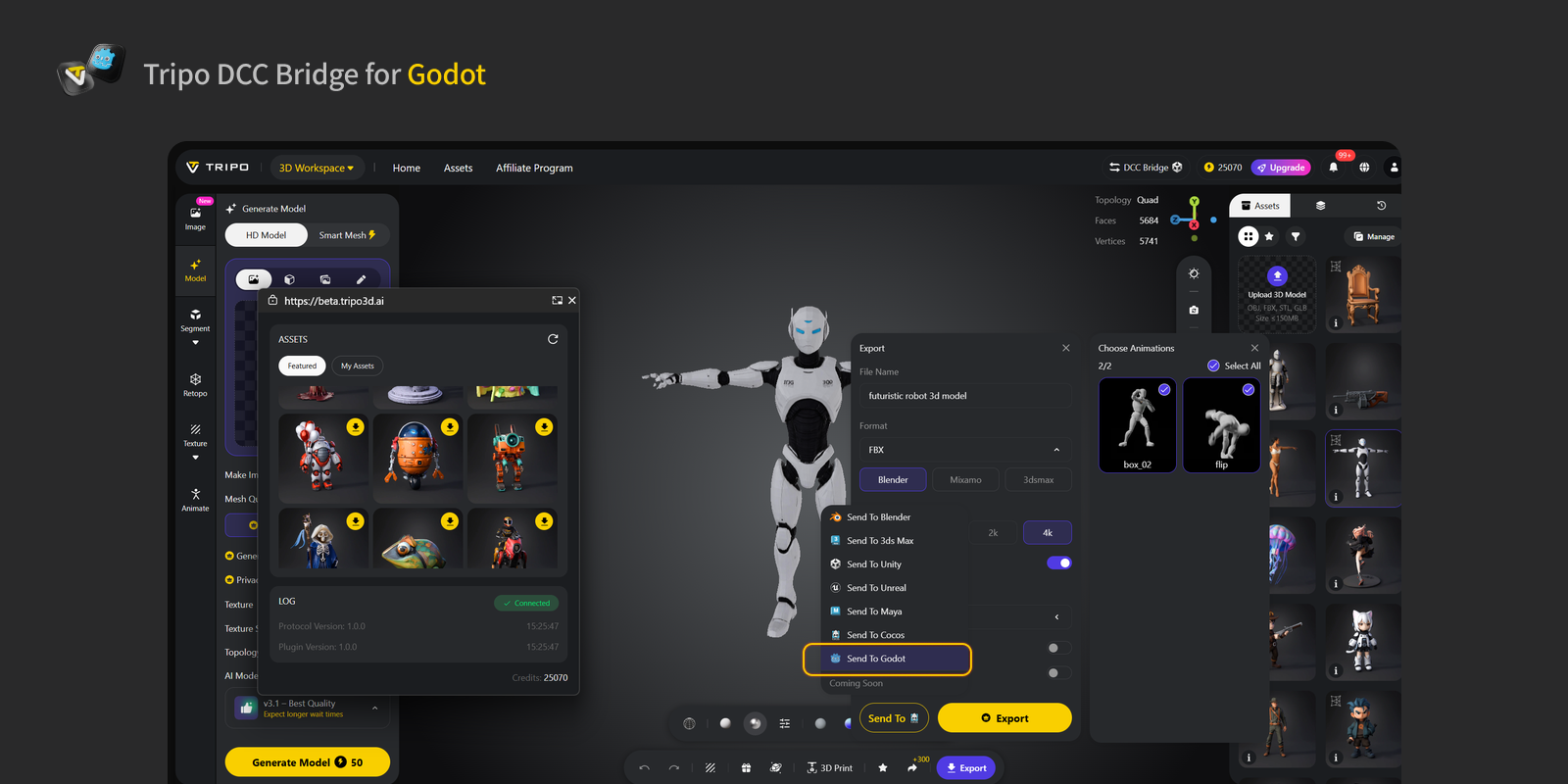 - If you want to export a model with animations, first generate the animations in Tripo Studio, then select the desired animations in the Export panel and send them directly to Godot.