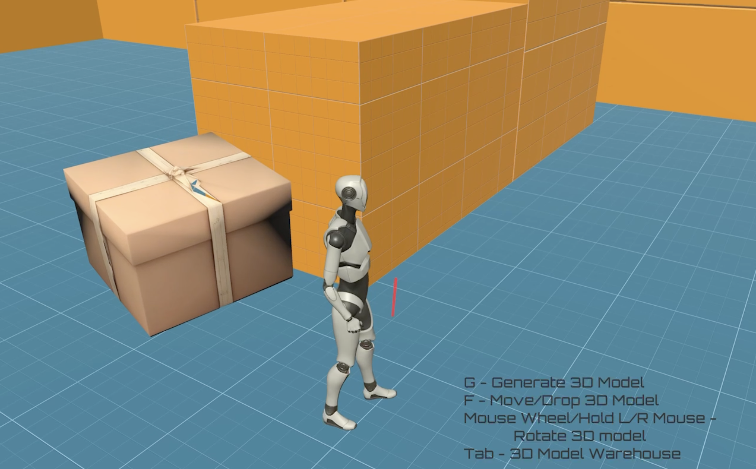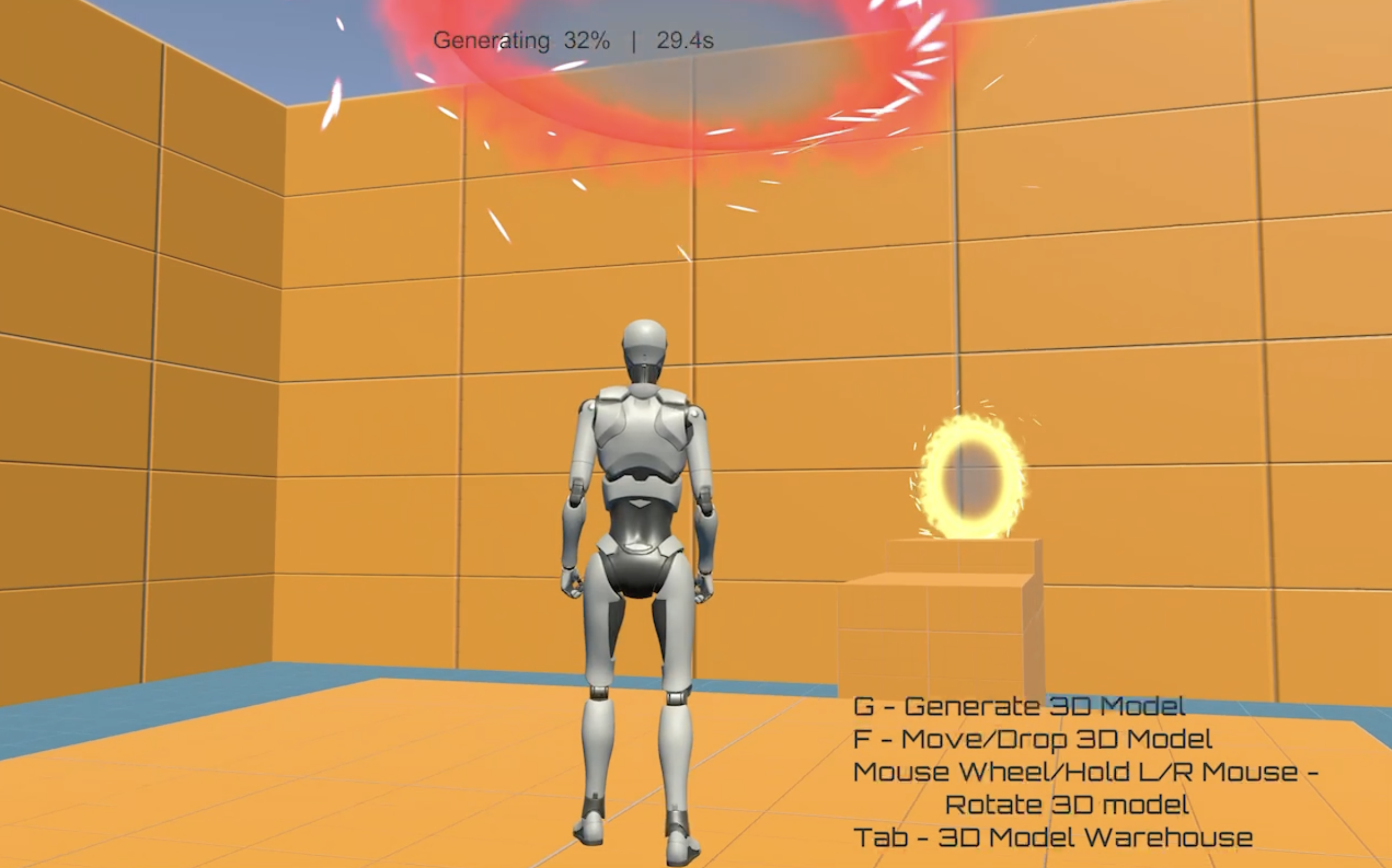 In each stage, enter your prompt anytime and press G to generate a 3D model; press F to pick up / drop; hold LMB / RMB / mouse wheel to rotate and fine-tune angles. Need a higher landing? Generate a "staircase." Need to cross a gap? Stack a few "boxes," then place a "jump board." Everything you've generated is saved to your Warehouse (Tab to open) and can be reused in later stages—turning ideas into tangible, standable puzzle tools step by step.