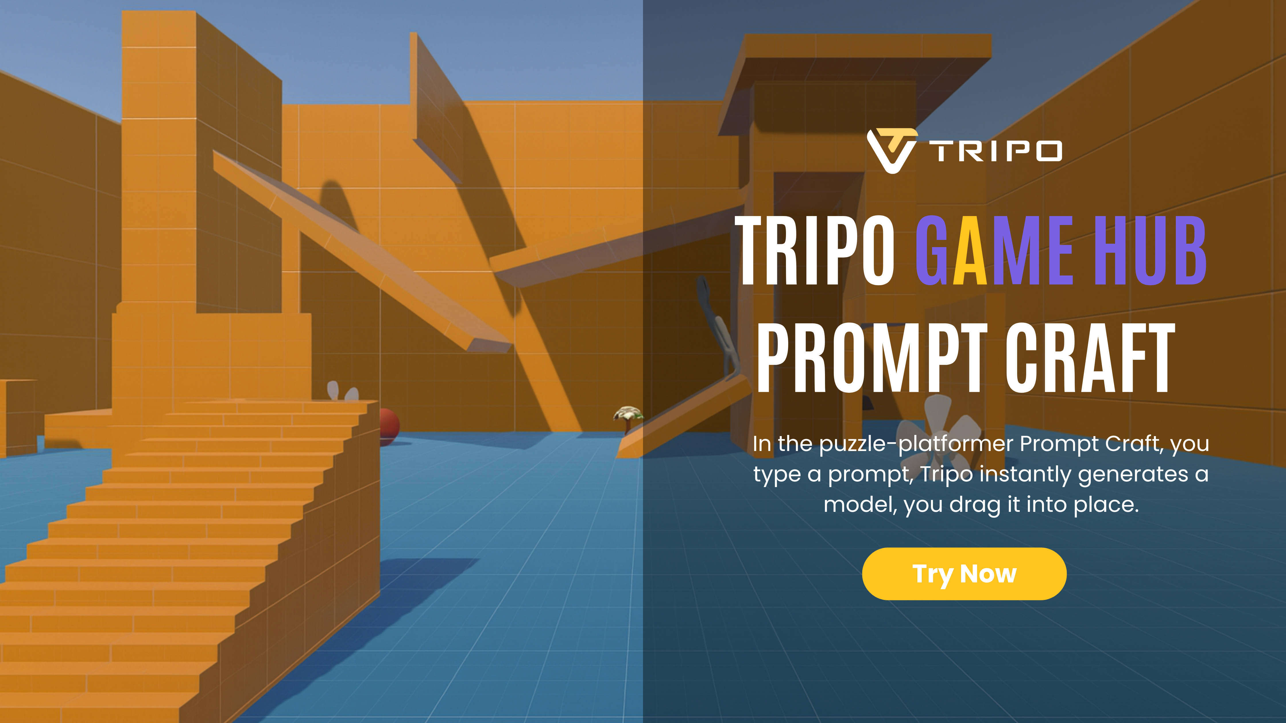 Ever wished a single line of text could turn your ideas into stackable, carryable, stand-on 3D props? In the puzzle-platformer PromptCraft, you type a prompt, Tripo instantly generates a model, you drag it into place—make steps, lay a springboard, bridge a gap—then dive into the glowing yellow portal to the next stage!