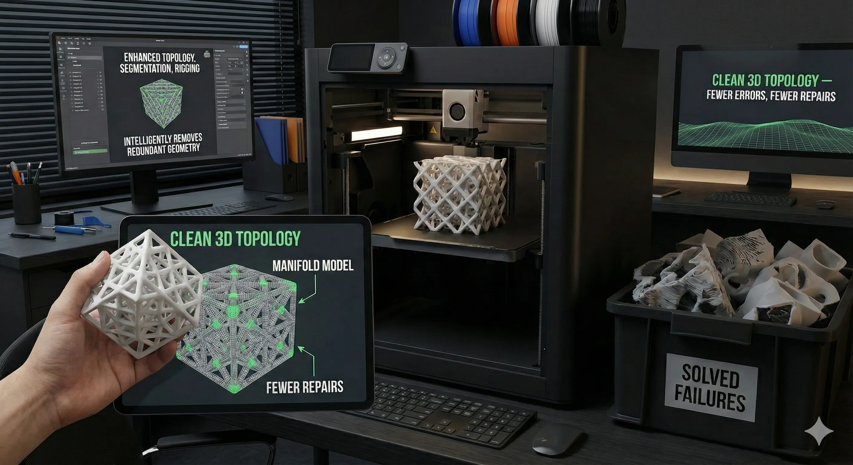 "Cut trial-and-error costs by 70%. The built-in optimization ensures models are always manifold and print-ready. Material waste is nearly eliminated."