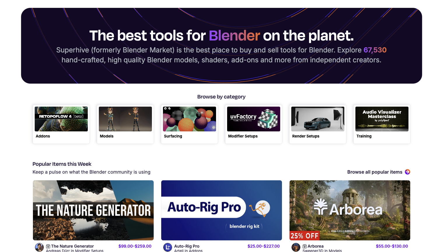 Blender Market (ahora Superhive) se especializa en activos para la comunidad Blender.