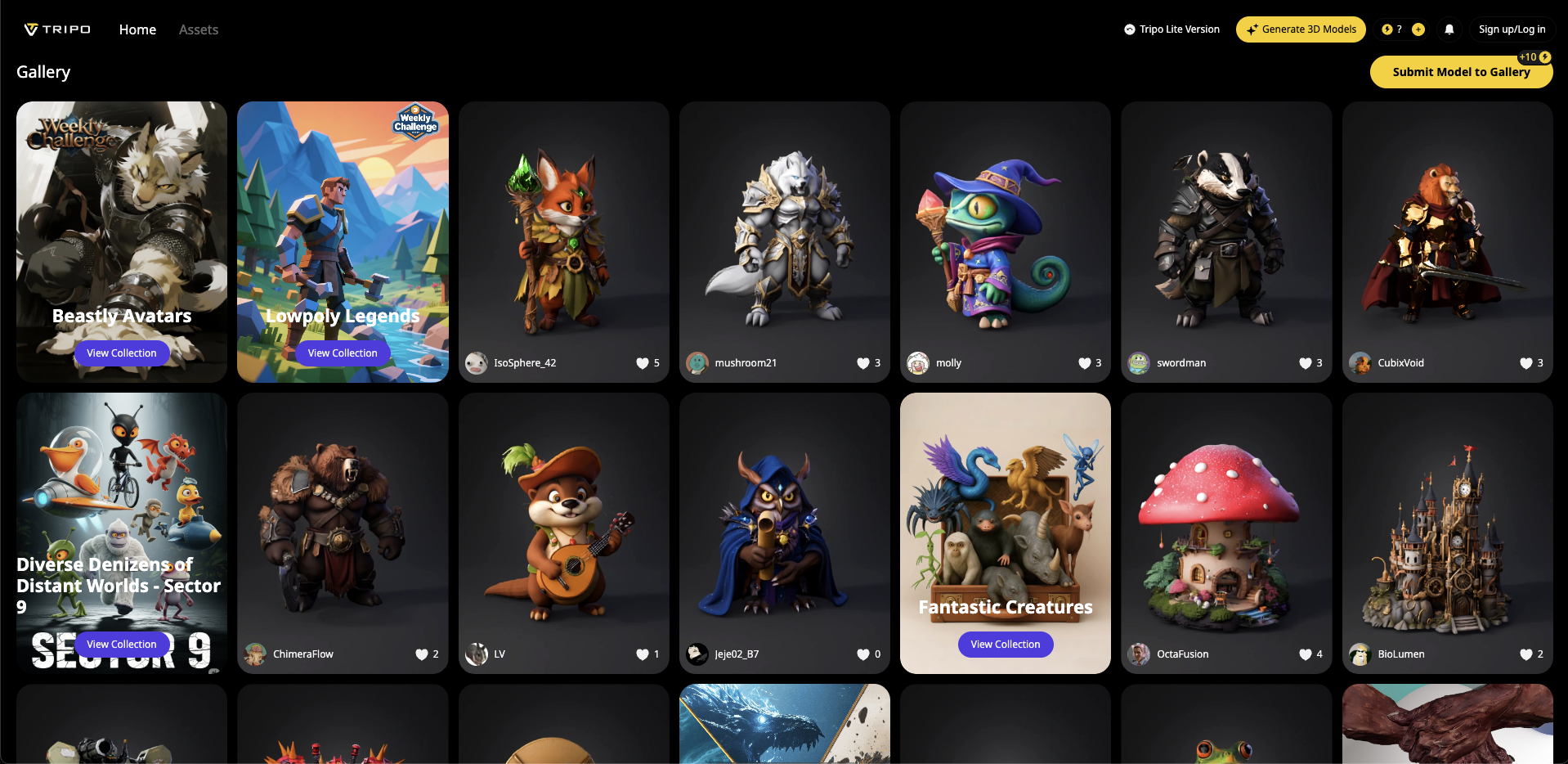 Diferenciador clave: Galería comunitaria con cientos de miles de modelos generados por usuarios con activos "remixables" y un pipeline de edición en la aplicación para una iteración rápida.