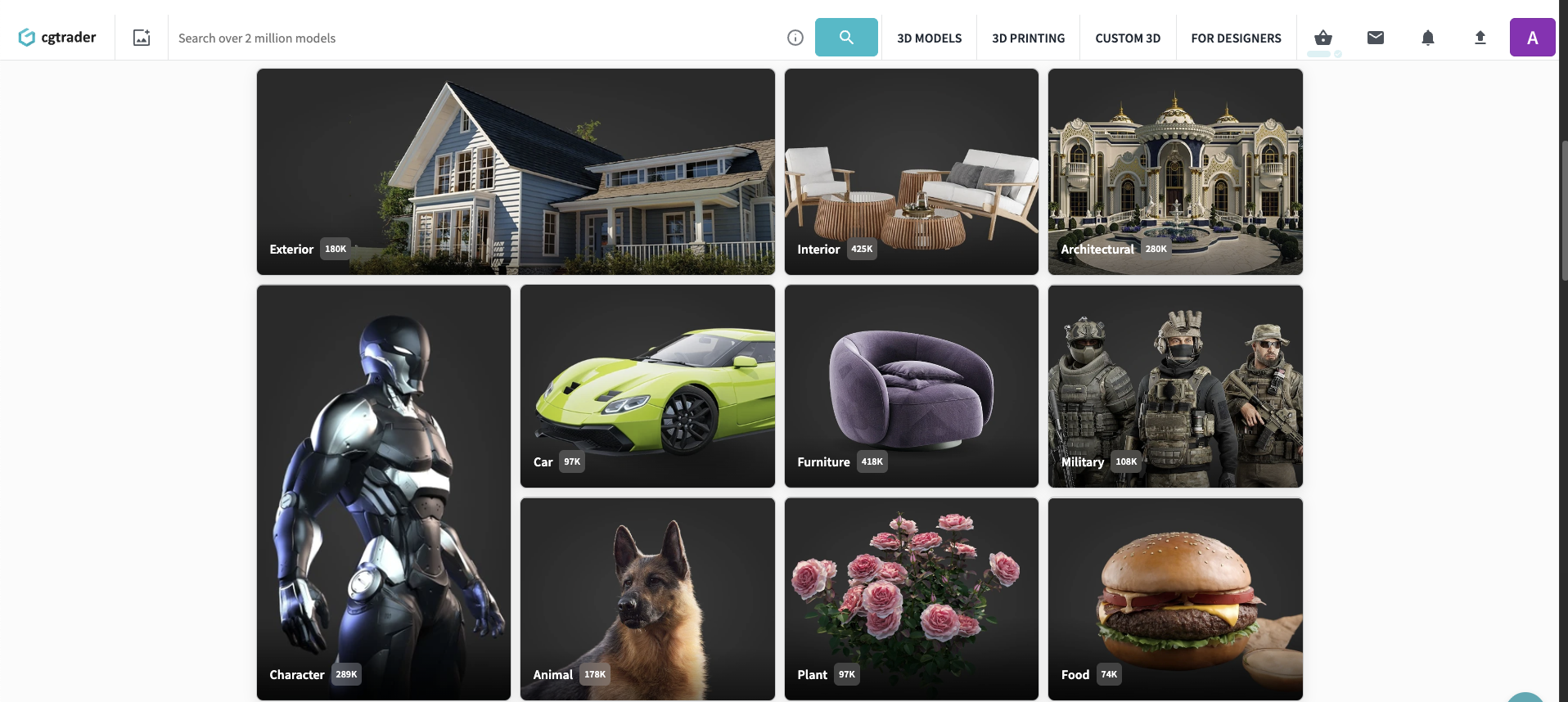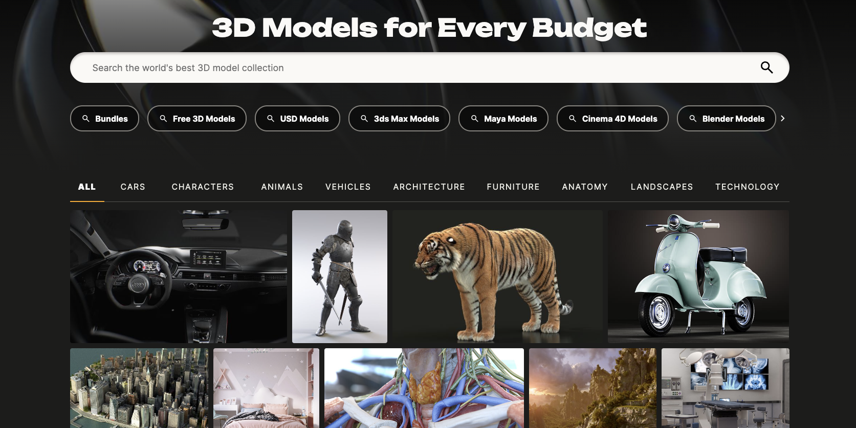 Ideal para: Catálogo diverso que incluye activos de juegos, modelos de visualización y bibliotecas multiformato para proyectos comerciales.