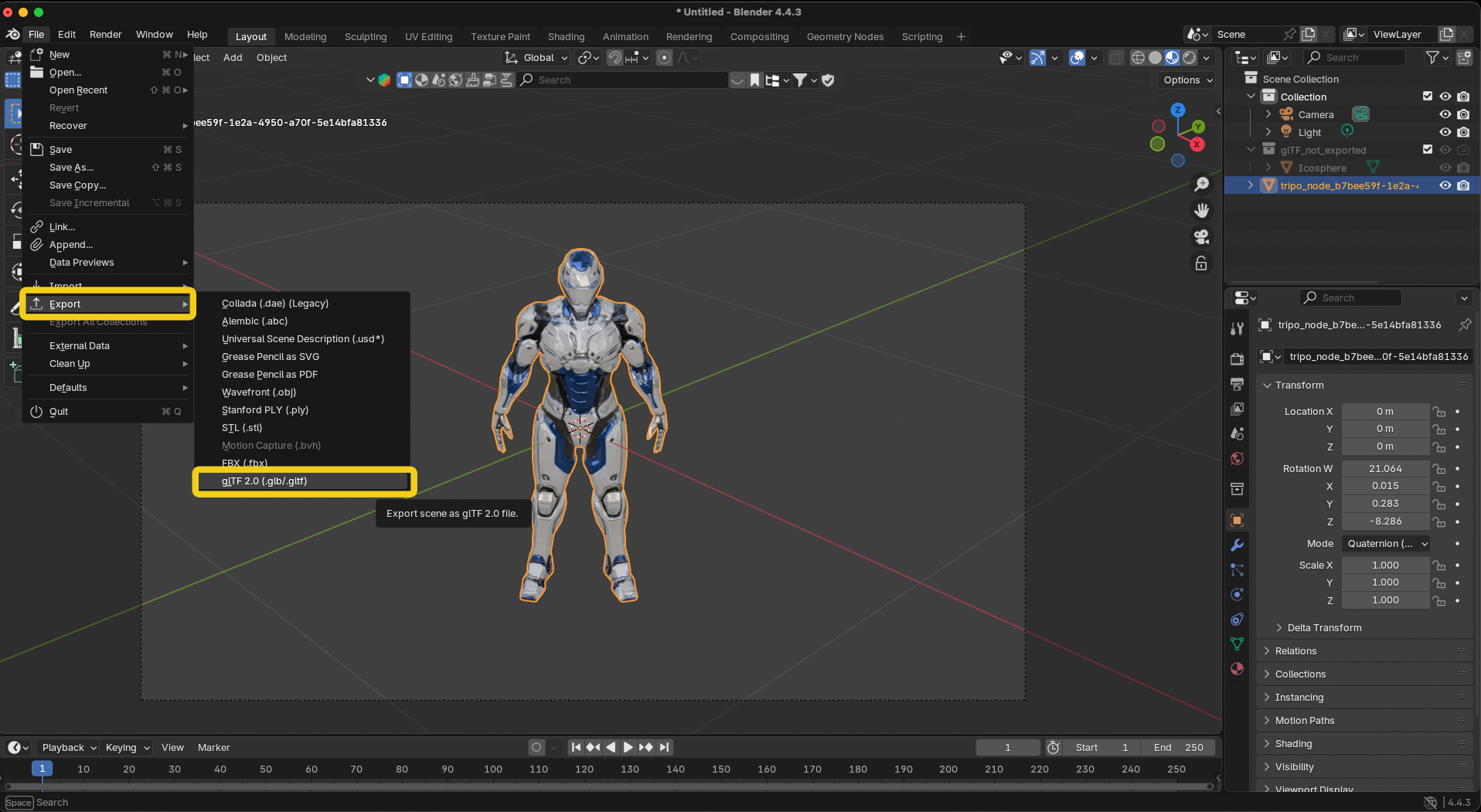 Verifica el panel de Transformación a la derecha; los valores de Rotación ahora deberían mostrar 0° para todos los ejes, aunque tu modelo esté visualmente erguido. Esto significa que la solución es permanente.