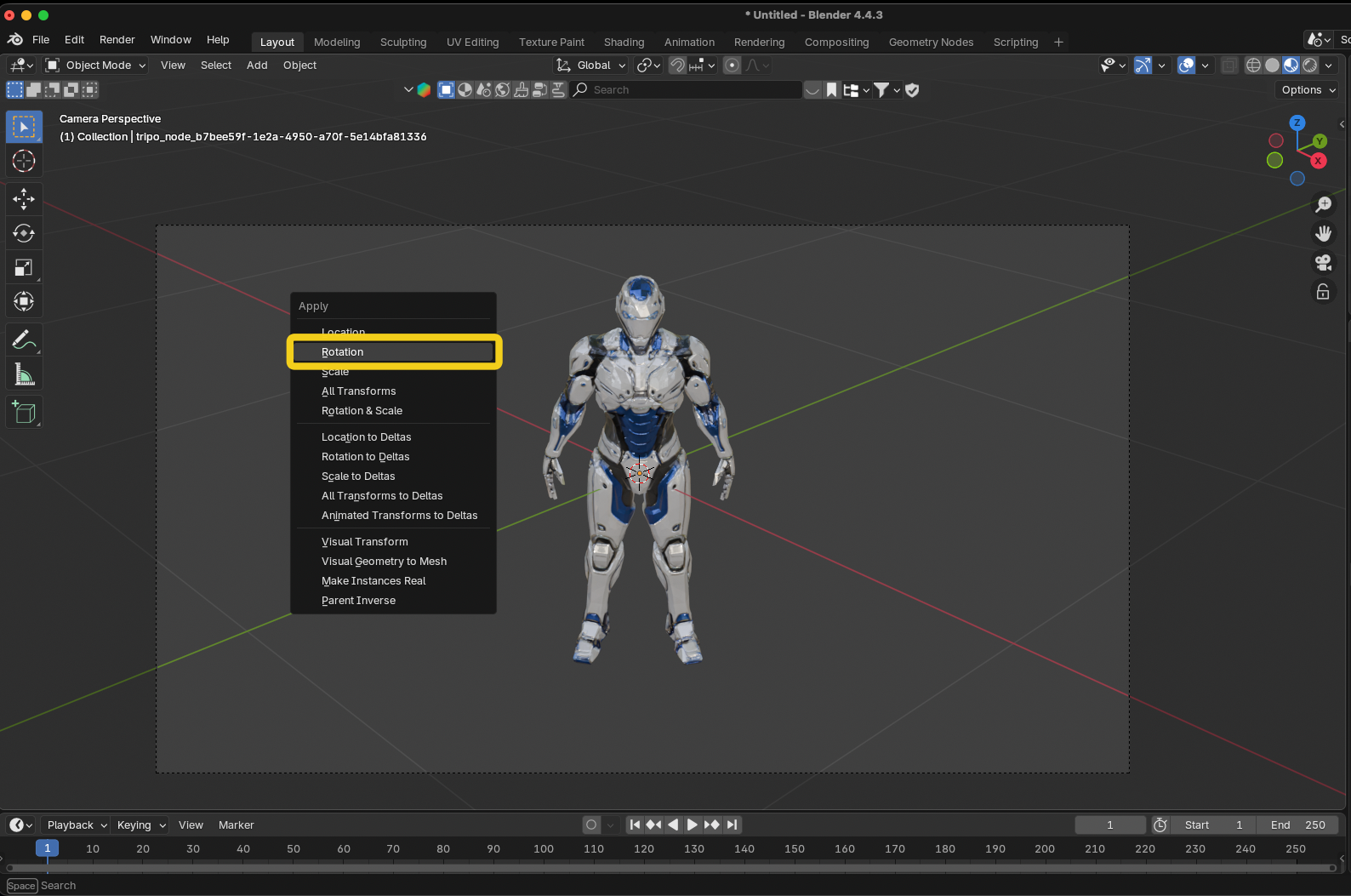 これが最も重要なステップです。この回転をモデルに「ベイク」する必要があります。