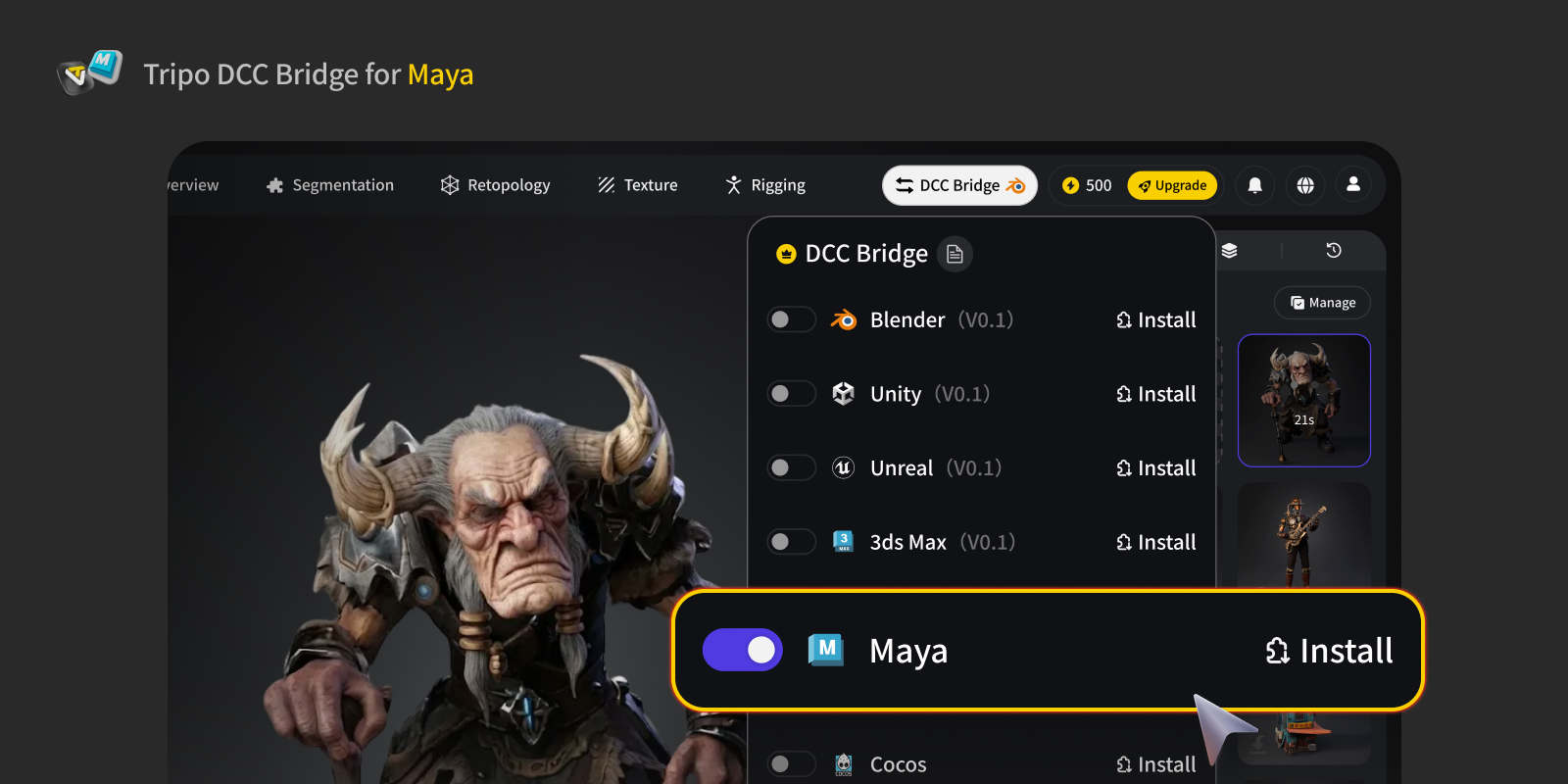 - Tripo Studioのウェブサイトを開き、DCC BridgeボタンをクリックしてMayaプラグインをアクティベートします。