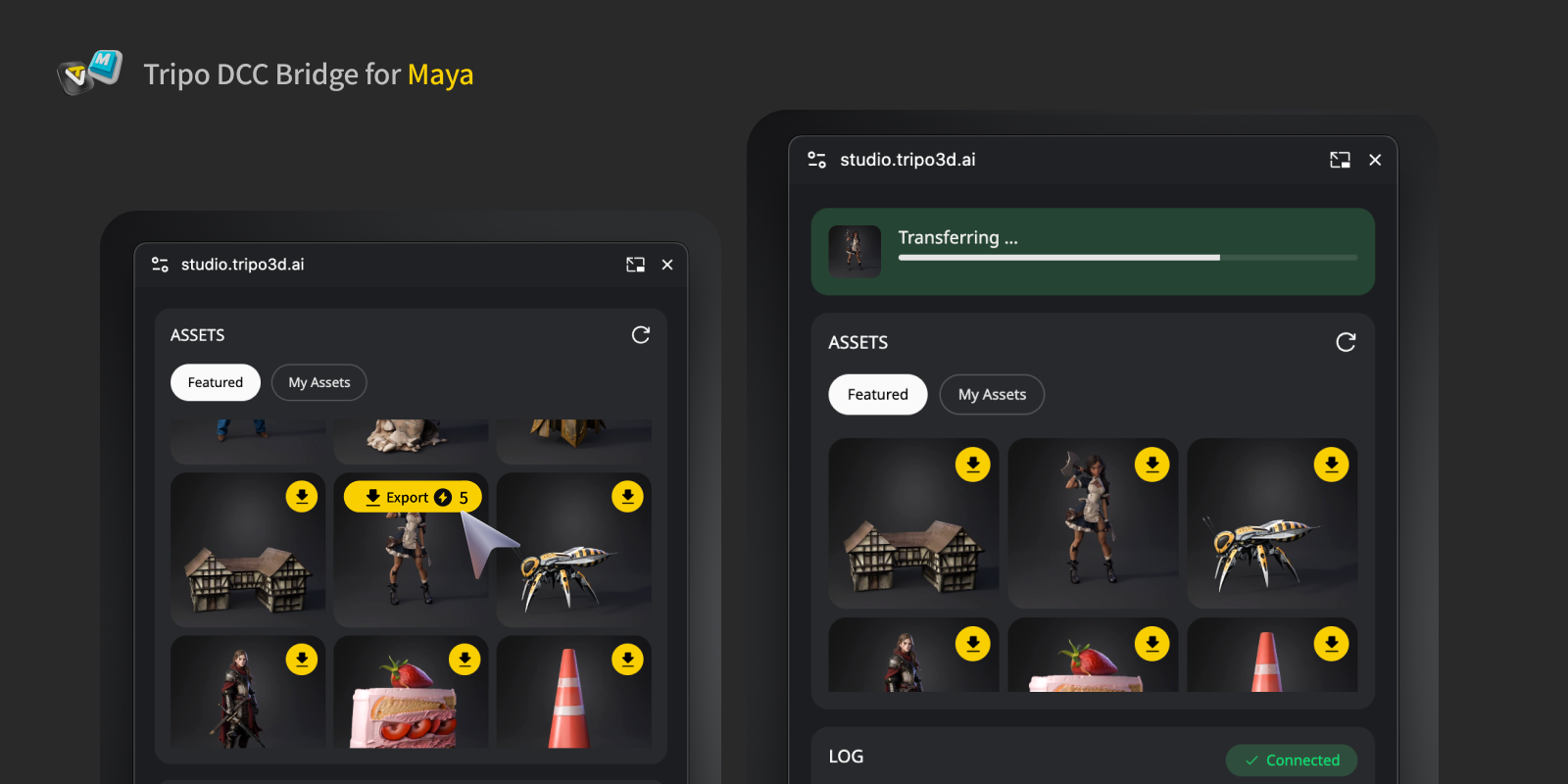 このブリッジを使用すると、生成されたモデルをブラウザからMayaにリアルタイムで直接送信できます。手動でのダウンロードやインポートは不要です。アーティストやデザイナーのワークフローを簡素化し、ファイル管理ではなくモデリングやシーンアセンブリに集中できるように設計されています。
