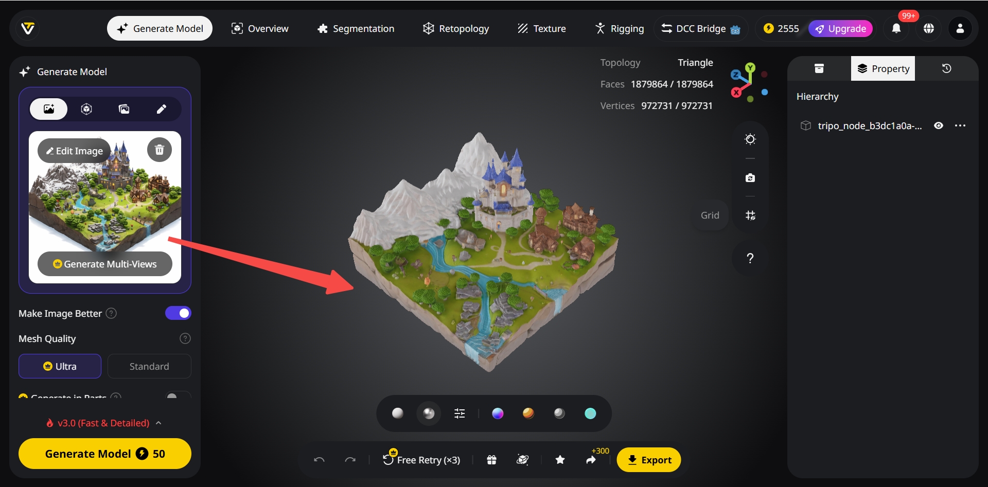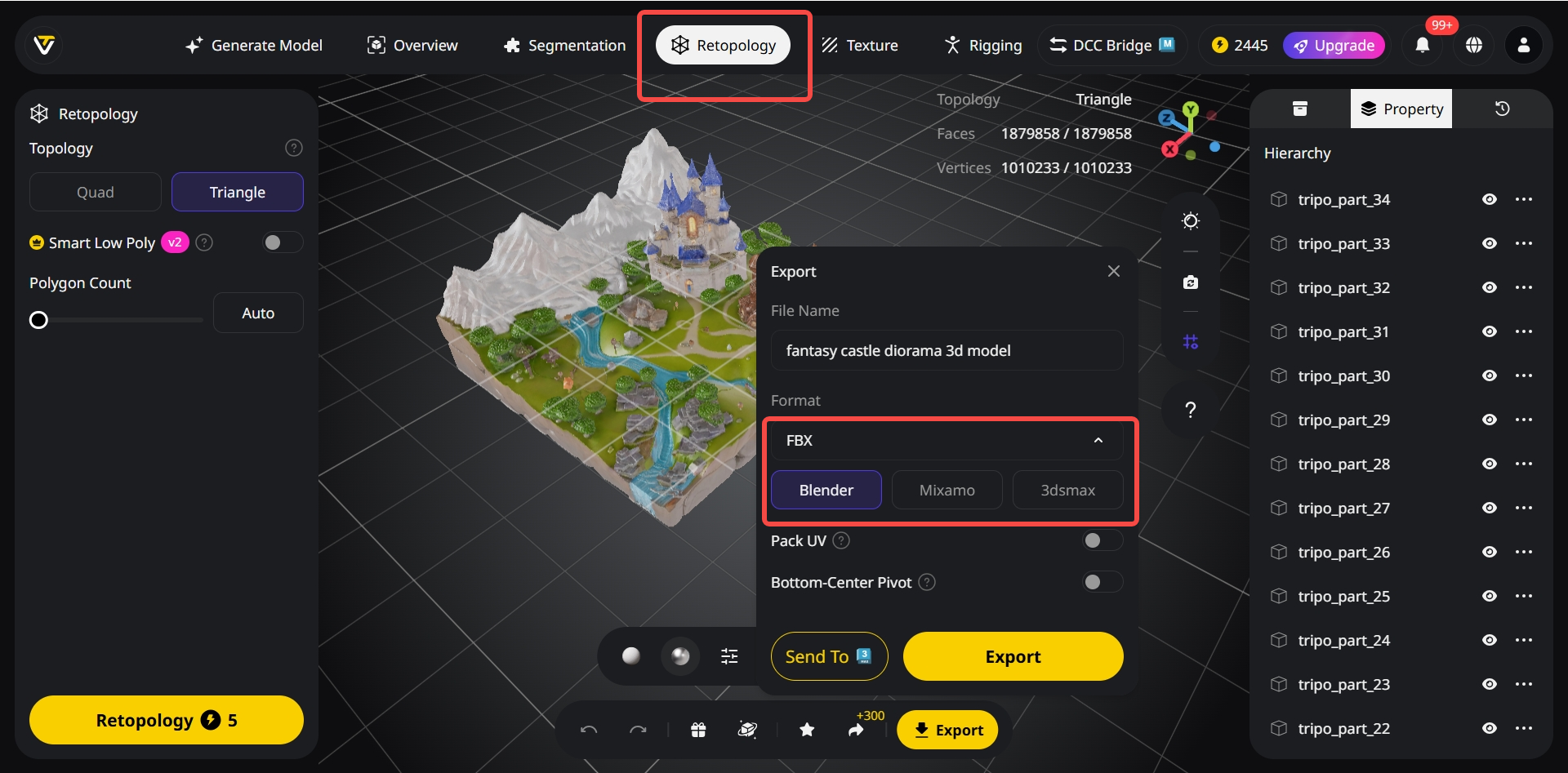Uma cena bonita é inútil se travar uma game engine. Antes da exportação final, garanto que os assets tenham uma topologia limpa e mapas de textura otimizados. Uso os recursos automáticos de retopology e UV unwrapping incorporados do Tripo para preparar as meshes geradas. Em seguida, exporto no formato correto (FBX, glTF) com hierarquia adequada e canais de material PBR (Base Color, Roughness, Normal) para minha plataforma alvo — Unreal Engine, Unity, ou um renderer como V-Ray.