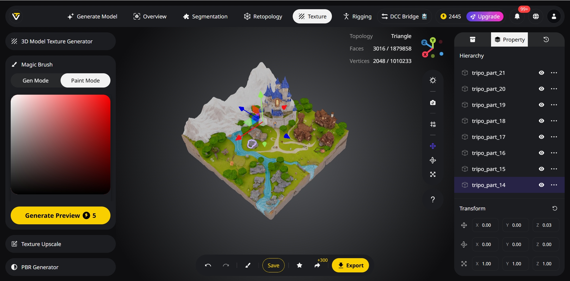 Evito meshes de "mundo" monolíticas. No meu fluxo de trabalho, aproveito o recurso de segmentação inteligente do Tripo, que separa automaticamente elementos distintos dentro de um objeto gerado (por exemplo, uma estante dos livros nela). Isso me permite, mais tarde, excluir, retexturizar ou animar partes independentemente, o que é essencial para a integração em um projeto interativo.