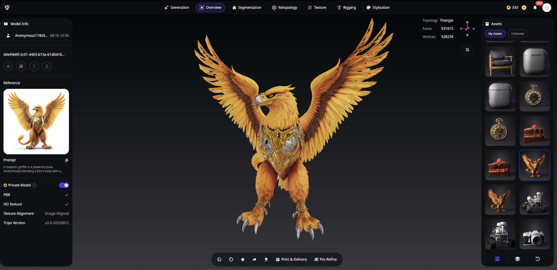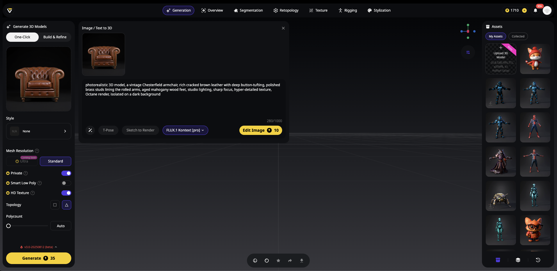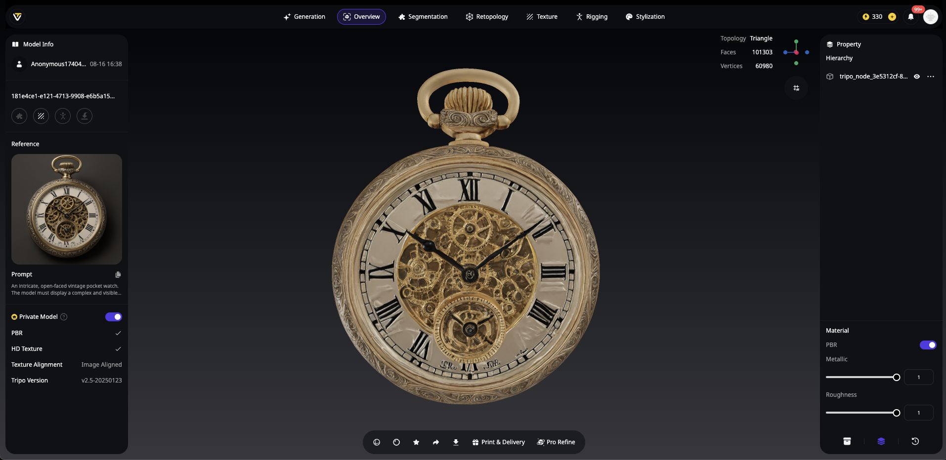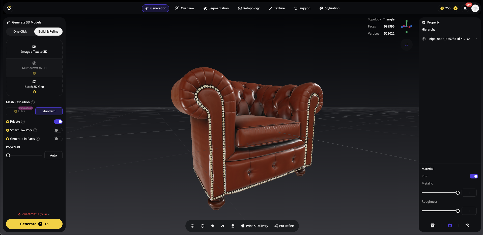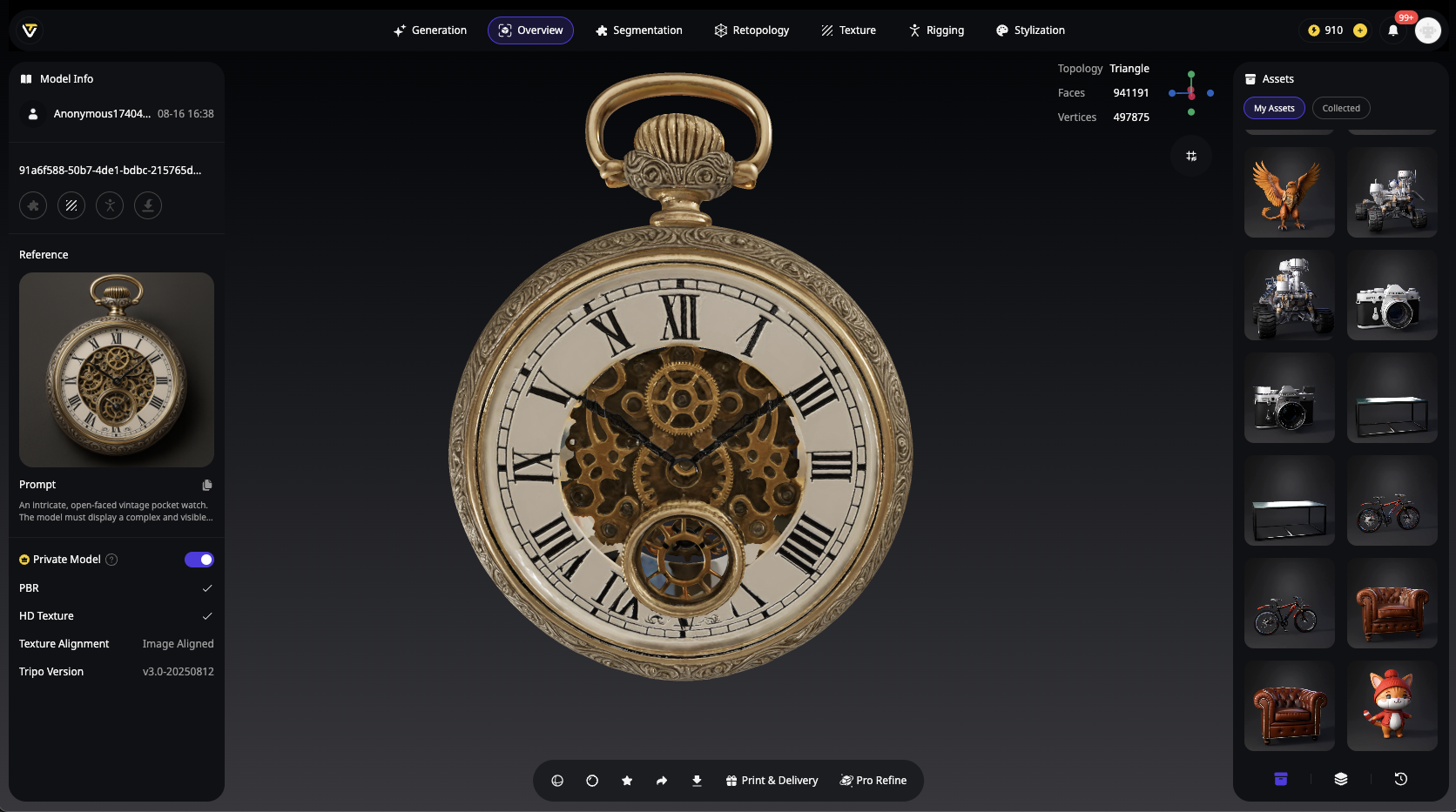 事情是这样的:Tripo 3.0 需要更长的时间。2.5 版本可以在 25-30 秒内生成模型,而 V3 平均需要大约 100 秒。有时多一点,有时少一点。但这就是为什么这实际上是个好消息:多出的 90 秒并没有浪费。它们被投入到创建细节如此丰富、如此精细的模型中,以至于它们可以与手工制作的作品相媲美。这样想吧 — 你是愿意在 10 秒内得到一个粗略的草图,还是在不到 2 分钟内得到一件杰作?